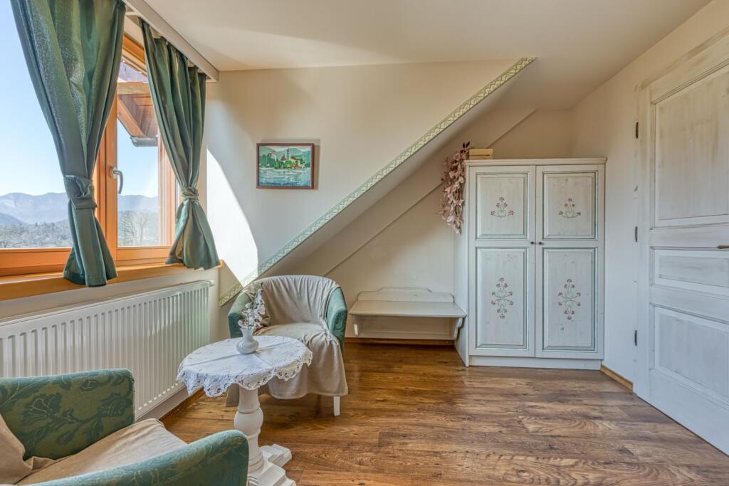 - Terrasse mit Aussicht auf das Bleder Schloss und das Bergland von Bohinj, auf die Julischen Alpen und die Karawanken